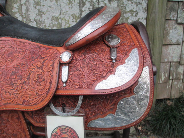 Six sterling silver corner plates, cantle plate, gullet plate (couple of small dents as pictured), conchos with tips, engraved D's--